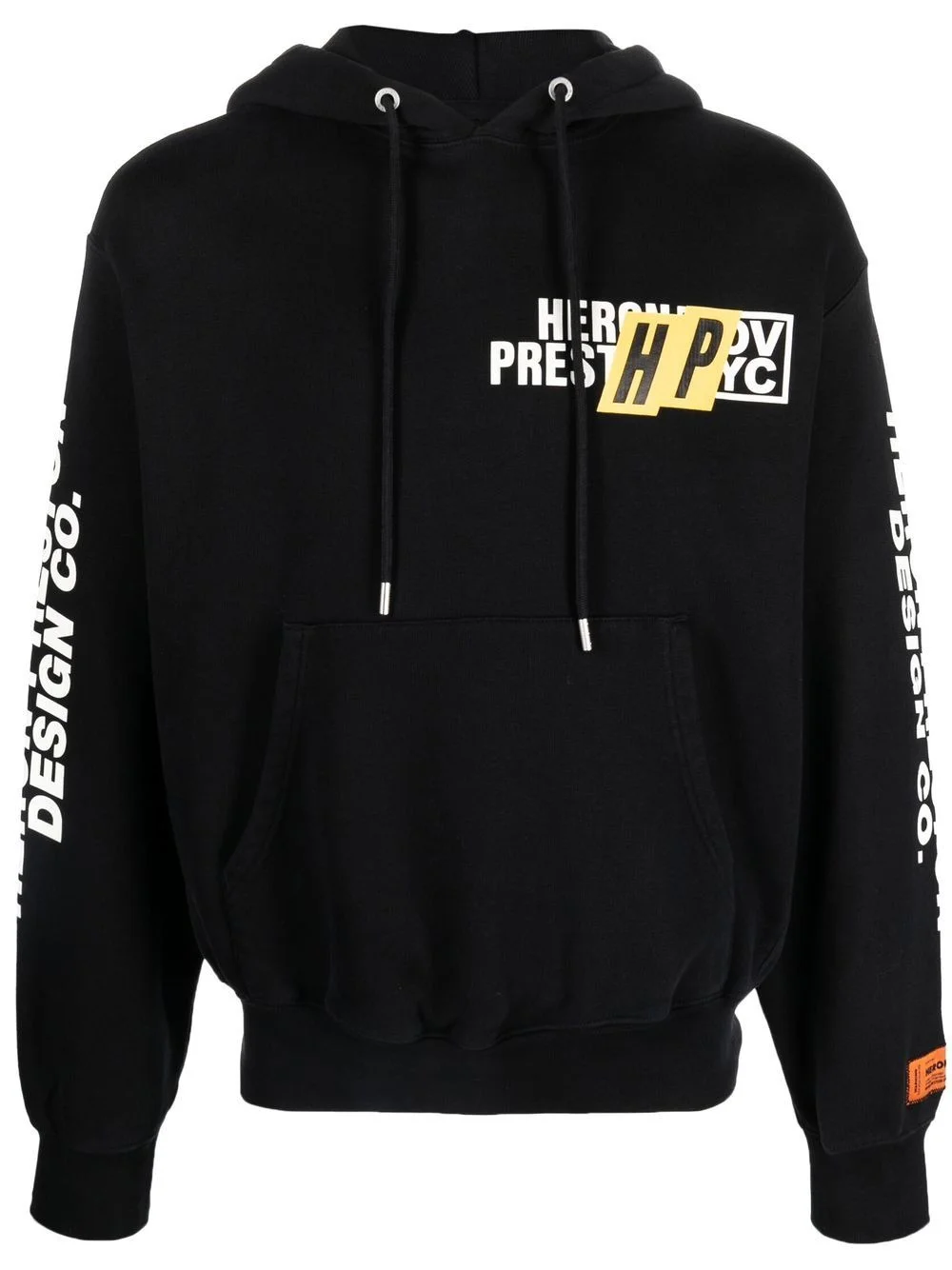 logo-print drawstring hoodie Heron Preston's hoodie is emblazoned with the streetwear brand's slogans and logo. The white letters pop against the black background. Imported Composition Cotton 100%, Polyester 100% SIZE & FIT Model measurements Height 6 ft 1 in(1.86 m) Bust/Chest 34.64 in(88 cm) Hips 35.43 in(90 cm) Waist 27.55 in(70 cm) FittingInformation This piece fits true to size. We recommend you get your regular size Cut for a loose fit Made with a mid-weight fabric Washing instructions Machine Wash