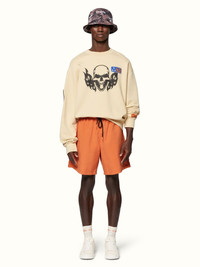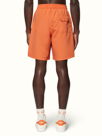 This garment is fully made with recycled polyester yarn. Orange nylon swimshorts with orange logo patch at leg. Side pockets and back pocket. Elasticized waistband. Black strings. 100% Polyester 100% Polyester Bust 80cm Height 150cm Hips 90cm Waist 60cm Product ID: HMFA005C99FAB0012200
