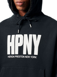 Black hoodie featuring white HPNY stamp at front. Pocket at front. Orange logo patch at sleeve. Rib knit cuffs and hem. 100% Cotton Model Omar Diagne wears size M Height: 6’ 1” (185 cm) Chest: 33” (84 cm) Waist: 28” (73 cm) Product ID: HMBB024C99JER0041001