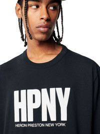Black t-shirt featuring white HPNY stamp at front. Orange logo patch at back. Crewneck collar. 100% Cotton Model Omar Diagne wears size M Height: 6’ 1” (185 cm) Chest: 33” (84 cm) Waist: 28” (73 cm) Product ID: HMAA032C99JER0051001