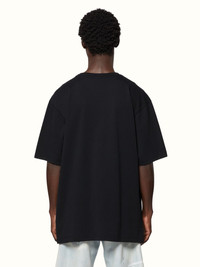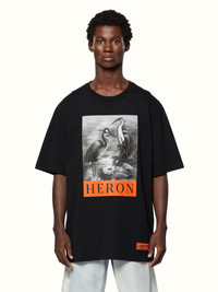This garment is made with organic certified cotton yarn. Short sleeves T-shirt in black with herons graphics printed at front. Orange logo patch sewn at front. Crewneck collar. Oversize fitting. 100% Cotton Bust 92cm Height 188cm Hips 98cm Waist 75cm Product ID: HMAA026C99JER0011001