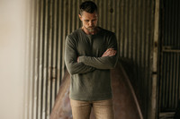 Looks can be deceiving. The soft look and thick drape of this fabric gives the sophisticated look of a sweater, while feeling as light and easy-wearing as a long sleeve tee. “The Drill” in double knit is not only something you look forward to wearing when you get home after a long day, but something you can go to work or dinner in and not look underdressed. To dress it up, this shirt is perfect for layering over our “The Ripper” button ups. Both “The Stamp” and “The Drill” adorn the signature Kato Brand orange stitch on the care tag, a subtle detail to be discovered by wandering eyes. Another detail that elevates above other standard tee shirts is the reinforced collar that will not stretch out or sag with use. These shirts are available in: Military Green, Blue, Black, and Heather Grey. Comfort is something Kato is known for, and we wanted to challenge ourselves by pushing the limits of comfort even further. You be the judge. Fit & Size The model is 6'1" and wearing the size M.