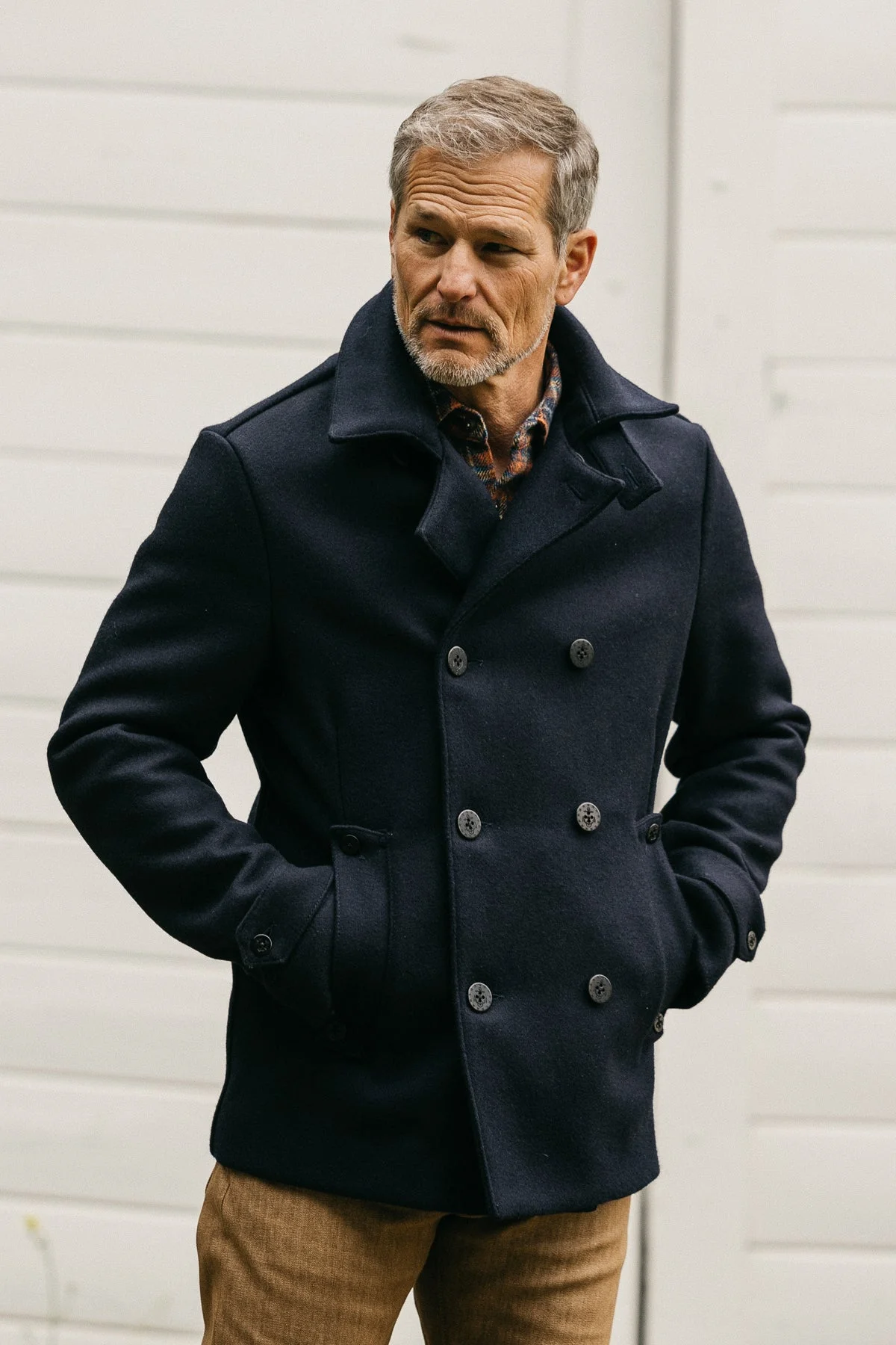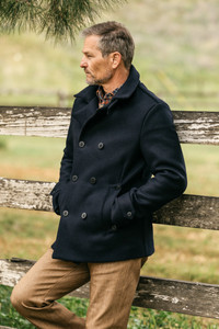 This sturdy wool jacket was originally used to protect men from the harsh conditions while traveling across the cold Atlantic ocean. The presence of this jacket attracts attention without being overtly flashy. Marked by its double-breasted silhouette and two rows of pronounced admiral style anchor buttons, “The Mallet” Peacoat commands respect as it braves the elements. We used a rugged yet soft 21oz Melton wool with 10% Nylon for added durability. Many peacoats feature 10 buttons but we opted for 8 to lend a more refined look. We also lowered the hand warmer pockets of ease of use and a more natural stance. The collar and cuffs are fitted with an adjuster strap, to help keep out wind and rain in harsh conditions. We refined the cut of the standard peacoat to have a slightly slimmer silhouette, adding a dash of elegance to this handsome coat. After careful consideration, we chose a length that gives you plenty of coverage but is not too long. Fit & Size Model is 5'11" and wearing size M.