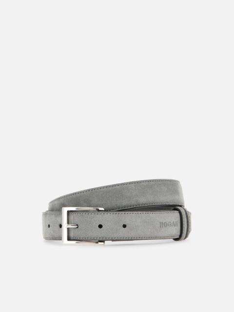 - Men's belt in suede - Made in Italy - Item crafted in suede - Smooth leather loop - Metal tongue buckle - Stamped Hogan logo - Width 1.2 ins - Maintenance and care cards included - Fabric dustbag included Belt in suede with tongue buckle. A versatile and timeless accessory, with stamped Hogan logo.