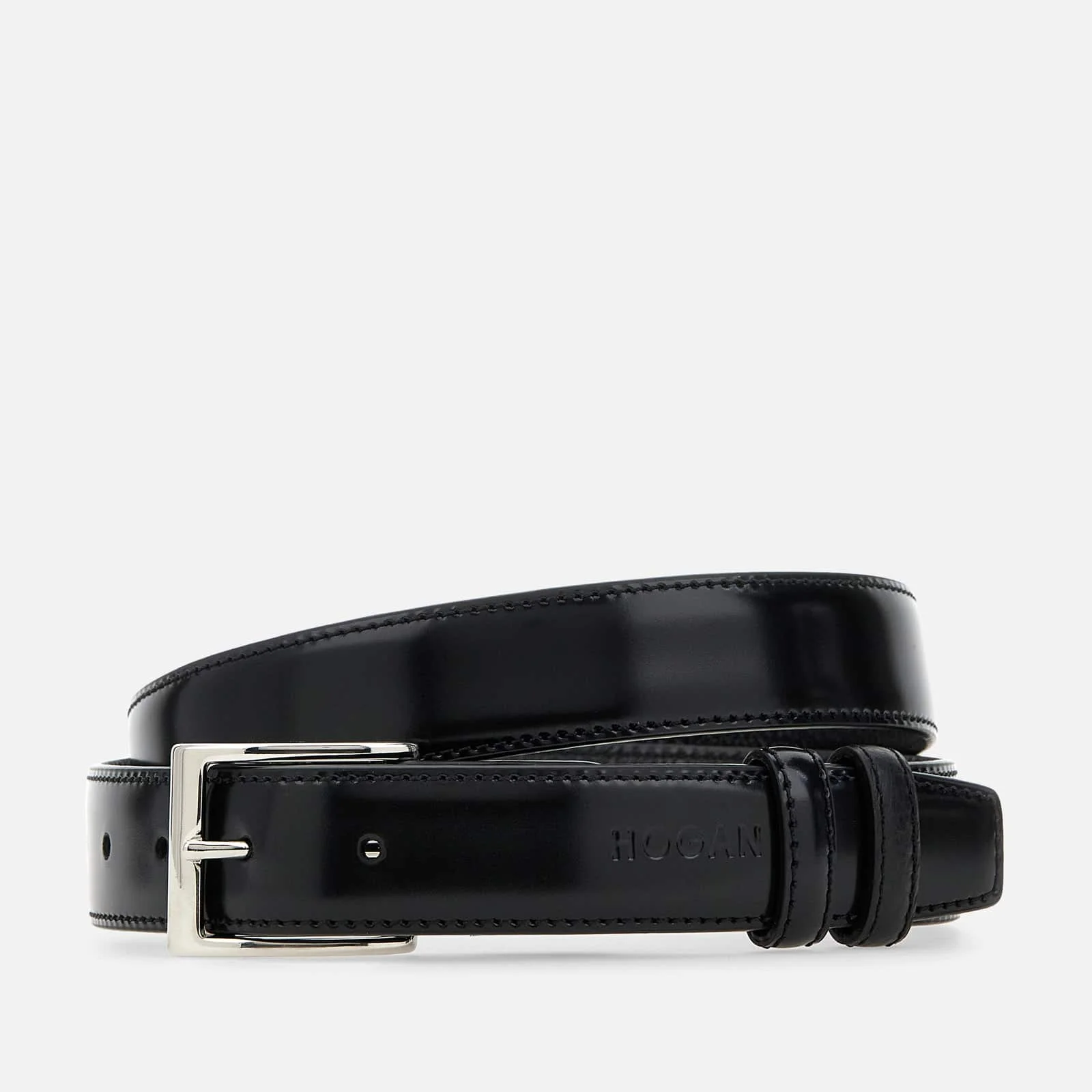 - Men's belt in leather - Item crafted in semi-shiny leather - Hammered effect leather loop - Metal tongue buckle - Stamped Hogan logo - Width 1.2 ins - Maintenance and care cards included - Fabric dustbag included Belt in semi-shiny leather with tongue buckle. A versatile and timeless accessory, with stamped Hogan logo. MOD. KFMC00N1100QR0B999