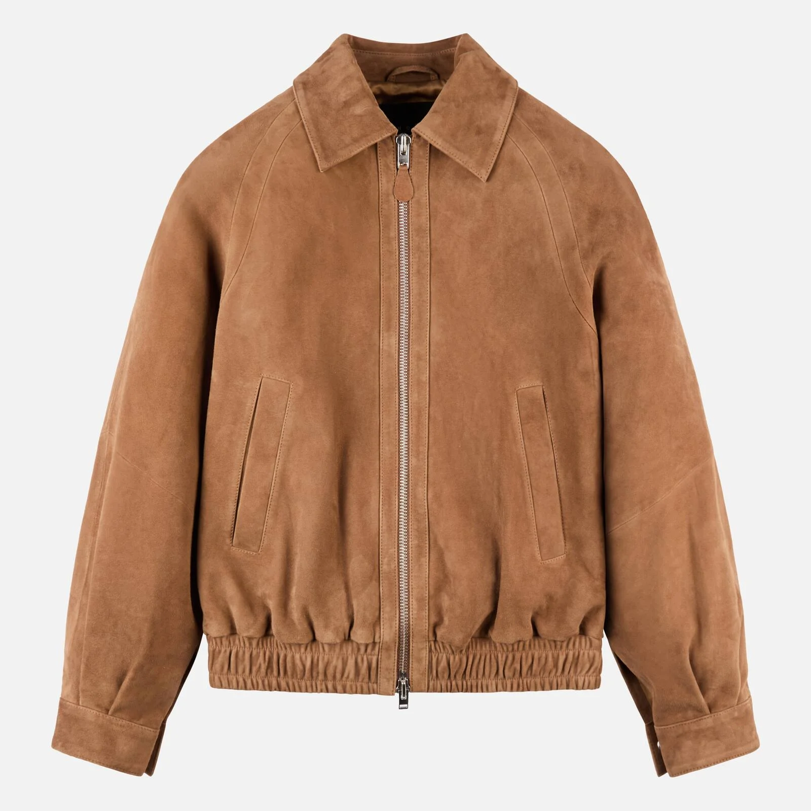 - Men's bomber jacket - Fitting: regular - Item composition: 100% goatskin leather, lining 100% polyester, sleeve lining 100% polyester - Maintenance and care cards included Raglan-cut bomber jacket in soft suede, with welt pockets and elastic bottom hem. Characterized by a shirt collar and cuffs with covered snaps, it features a practical double-slider zip.