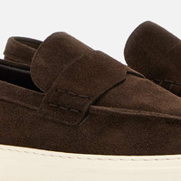 - Men's Hogan H-TV Loafers - Suede upper - Penny bar - Handmade stitching - Memory foam insole 0.3 ins - Rubber outsole - Total height 1.4 ins - Maintenance and care cards included - Fabric dustbag included Clean lines and crisp definition, a nostalgic throwback to 1980s tech gear is the inspiration for the Hogan H-TV style. This loafer version, in suede, features a lightweight upper and penny bar with handmade stitching. The memory foam insole guarantees a cushioned fit.