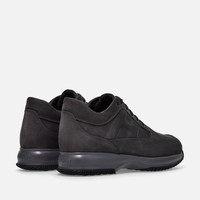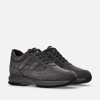 - Men's Hogan Interactive sneakers - Made in Italy - Suede upper - Exposed stitching - Padded H on the side - Removable footbed 0.7 ins - Rubber outsole - Care and maintenance tag included - Designer dustbag included A timeless icon, Interactive was born in 1997 and affirms itself as an accessory of pure design. Reinvented season after season, diverse interpretations are created thanks to the use of a mix and match of materials and textures. The new version, in suede, is characterized by a side, padded H with perfect, casual-sporty style. SIZE and FIT: wide fit, we advise you to opt for half a size smaller. MOD. HXM00N000106RNB612