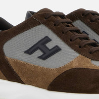 - Men's Hogan Interactive Sneakers - Made in Italy - Suede upper - Technical fabric inserts - Smooth leather detailing - Exposed stitching - Embossed side H - Removable insole rise 0.5 ins - Total height 2.2 ins - Rubber outsole - Maintenance and care cards included - Fabric dustbag included - Additional laces included A timeless icon, Interactive was created in 1997 and has established itself as a pure design accessory. Renewed season after season, it is suitable for the most diverse interpretations thanks to the mix & match of different textures and details. The new version in suede with side Hogan logo is characterized by contemporary smooth leather detailing and technical fabric inserts. Casual sporty style.