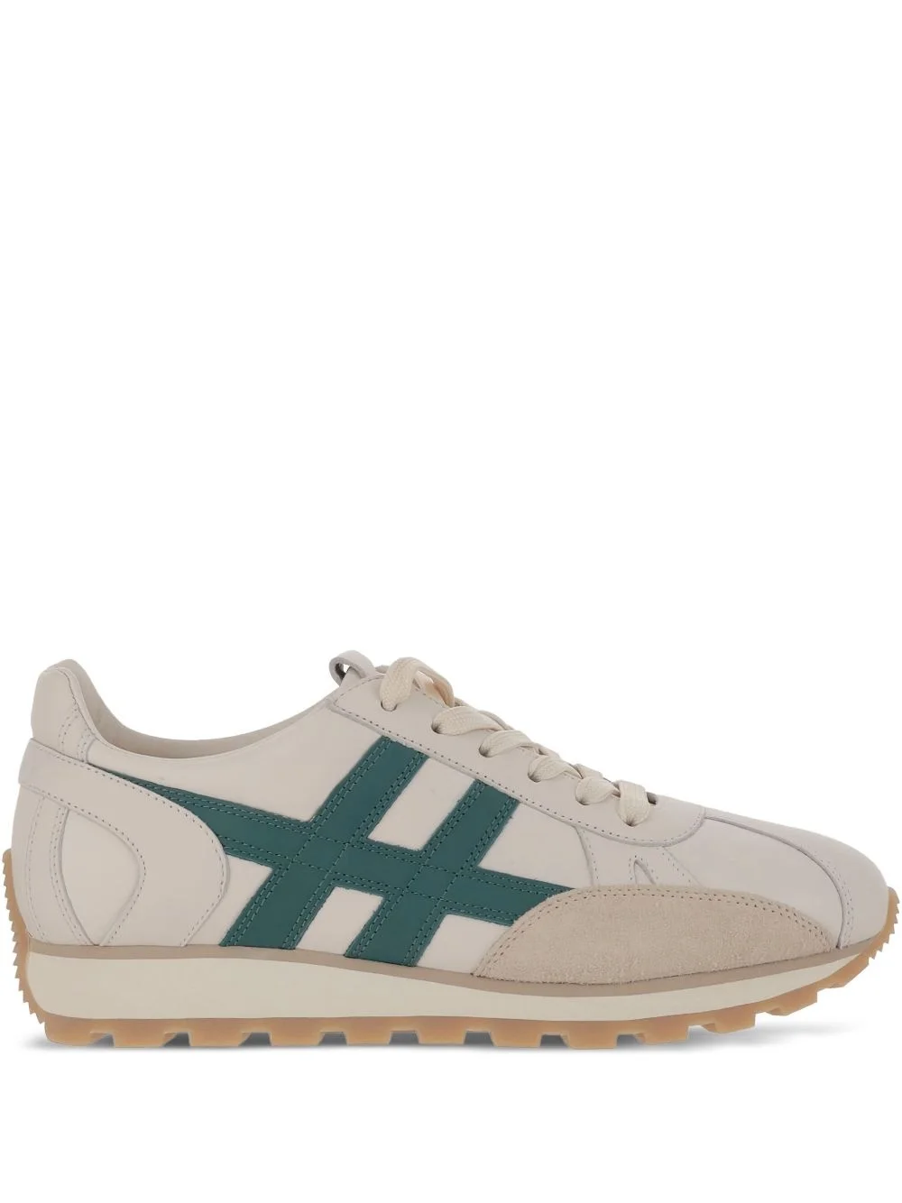leather lace-up trainers Highlights - Off-white - Leather upper - Green leather side stripes - Lace-up front - Suede heel panel Made in Italy Composition Outer: Calf Leather 100%, Calf Suede 100% Lining: Fabric 100% Sole: Rubber 100%