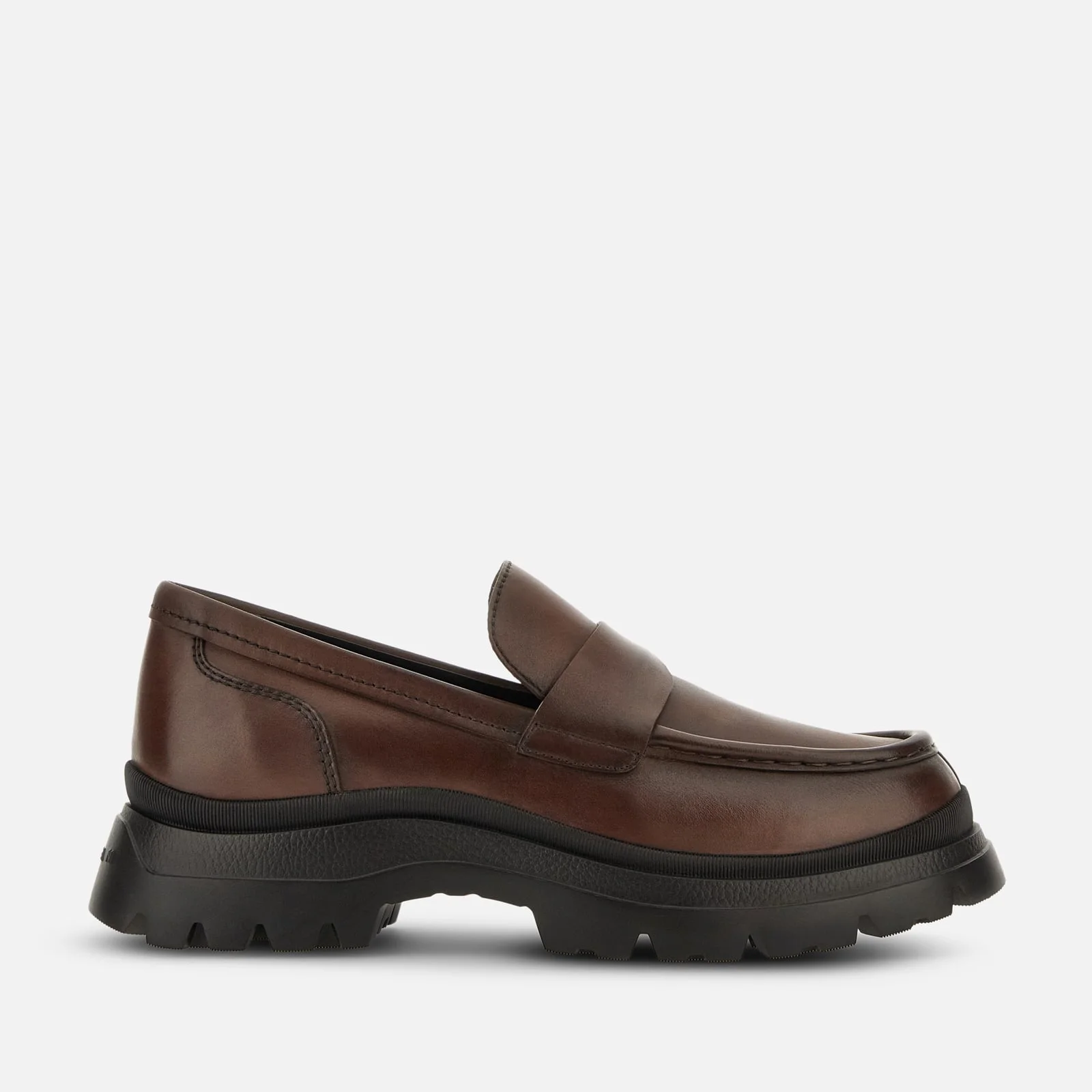 - Men's Hogan H692 Loafers - Made in Italy - Leather upper - Brushed finishing - Shaped penny bar - Leather lining - Memory foam insole - Rubber lugged outsole - Total height 2.4 ins - Maintenance and care cards included - Fabric dustbag included Sculptural and chunky: a hiking-boot sole construction juxtaposed with a sophisticated shoe upper defines this new urban hybrid style. Crafted in brushed leather, the Hogan H692 loafer features an elegant shaped penny bar and a comfortable memory foam insole.