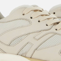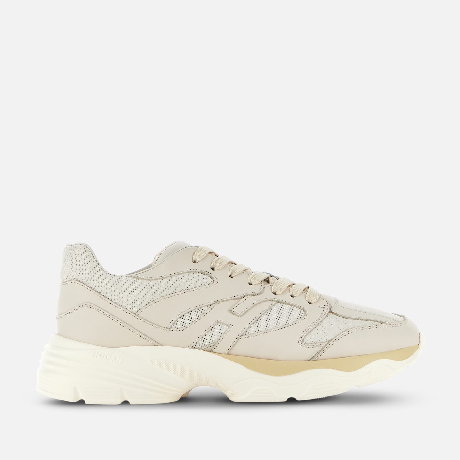 - Men's Hogan H665 Sneakers - Made in Italy - Leather upper - Perforated and punched manufacturing - Side H - Memory foam insole - EVA outsole - Strobel construction - Maintenance and care cards included - Fabric dustbag included - Additional laces included The Hogan H665 sneakers renew the contemporary combination of sporty aesthetics and urban nature. Lightweight and flexible, thanks to the special construction, they come with a two-tone extralight EVA outsole. The leather upper, lightened by perforations and a front punching, features an extended H that envelopes the heel. The memory foam insole guarantees softness and cushioning.