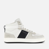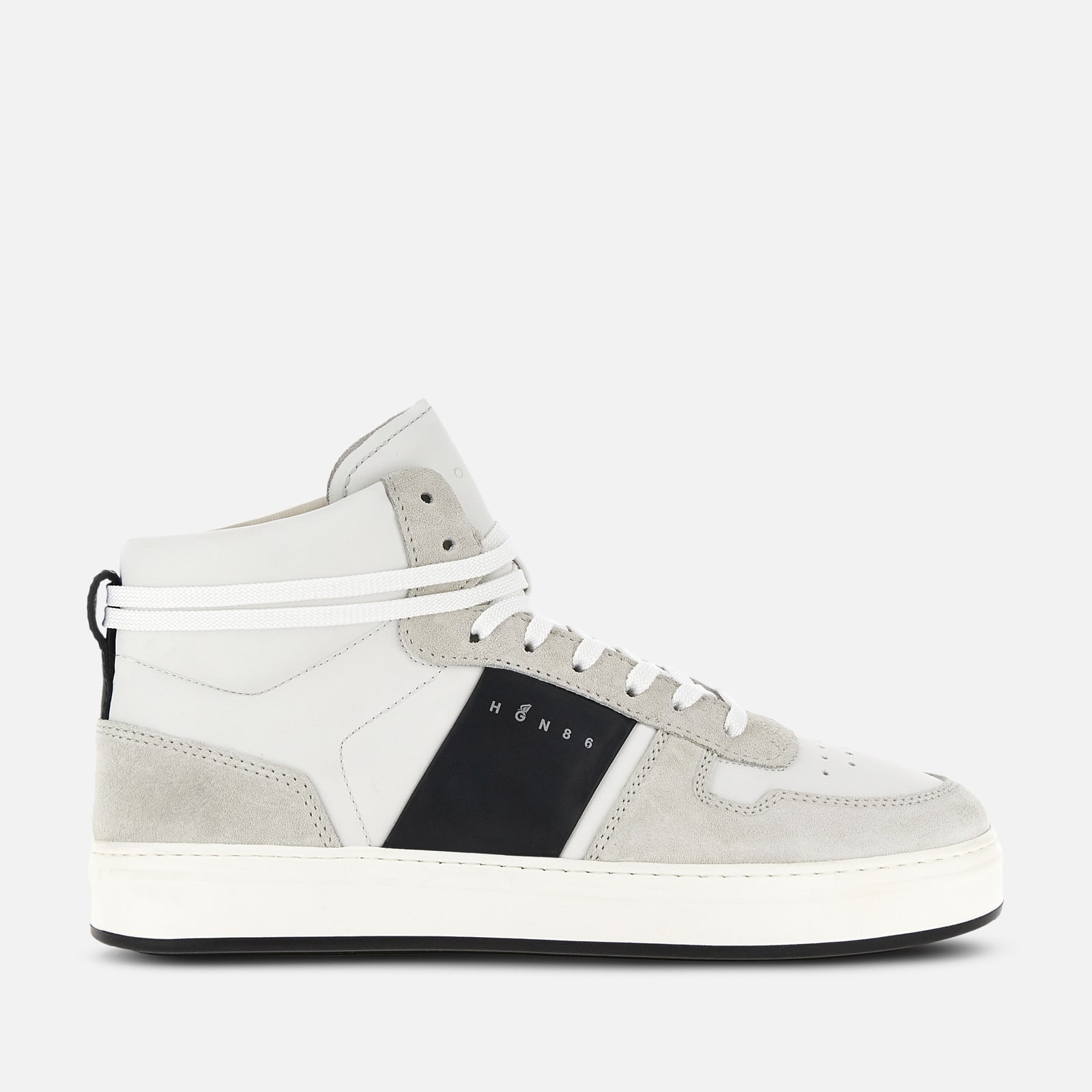 - Men's Hogan H-TV Hi-Top Sneakers - Suede upper - Smooth leather inserts - HGN86 logo stamped on the side - Memory foam insole 0.3 ins - Rubber outsole - Total height 1.4 ins - Maintenance and care cards included - Fabric dustbag included - Additional laces included Clean lines and crisp definition, a nostalgic throwback to 1980s tech gear is the inspiration for these Hogan H-TV sneakers. Characterized by a lightweight outsole with a minimal style, they feature an upper recalling the lines of the basketball world. Enhanced by the HGN86 logo printed on the side, they come here in a high top version, crafted in smooth leather and suede. The memory foam insole guarantees a cushioned fit.
