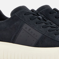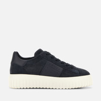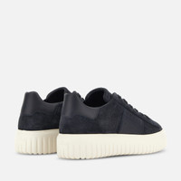 - Men's Hogan H-Stripes Sneakers - Made in Italy - Suede upper - Smooth leather side band - Memory foam insole 0.3 ins - EVA outsole - Total height 1.9 ins - Maintenance and care cards included - Fabric dustbag included - Additional laces included Style with sporty and versatile lines, the H-Stripes sneakers feature an extralight outsole with vertical stripes. The upper, with a compact and balanced design, is characterized by a side band with logo. The upper trim, featuring stitching on the back patch, comes with a soft padding. This version is crafted in suede, with a memory foam insole that guarantees comfortable cushioning.
