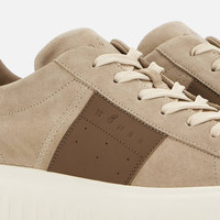 - Men's Hogan H-Stripes Sneakers - Made in Italy - Suede upper - Smooth leather side band - Memory foam insole 0.3 ins - EVA outsole - Total height 1.9 ins - Maintenance and care cards included - Fabric dustbag included - Additional laces included Style with sporty and versatile lines, the H-Stripes sneakers feature an extralight outsole with vertical stripes. The upper, with a compact and balanced design, is characterized by a side band with logo. The upper trim, featuring stitching on the back patch, comes with a soft padding. This version is crafted in suede, with a memory foam insole that guarantees comfortable cushioning.