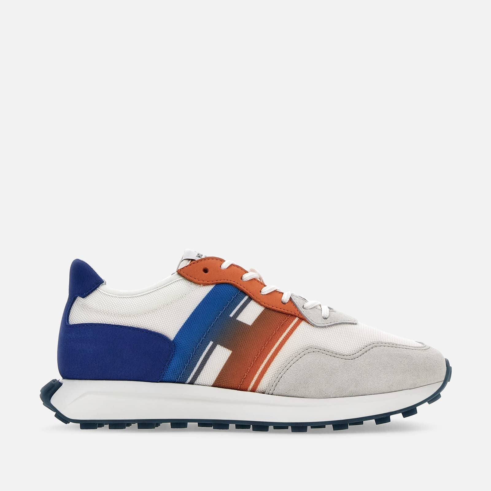 - Men's Hogan H601 Sneakers - Made in Italy - Suede and nubuck upper - Technical fabric inserts - Dégradé print side H - Memory foam insole 0.3 ins - Rubber outsole - Total height 1.8 ins - Maintenance and care cards included - Fabric dustbag included Bold look, cool style and retro vibes come together in the men's Hogan H601 sneakers. Designed for optimal grip, the lightweight outsole reinterprets the historical 261 style, adding a side grooving and an outsole with H-shaped spikes. The upper is crafted in suede, nubuck and technical fabric, with dégradé side H. The memory foam insole guarantees a comfortable fit. MOD. HXM6010ES10NDF847J