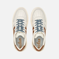 - Men's Hogan H630 Sneakers - Made in Italy - Smooth leather upper - Suede inserts - Smooth leather side H - Memory foam insole 0.4 ins - Rubber outsole - Total height 1.5 ins - Maintenance and care cards included - Fabric dustbag included - Additional laces included New sneakers with retro vibes, the Hogan H630 High Top combines lines belonging to the basketball world and classic brand style. The smooth leather upper with suede inserts features an extended H that envelopes the heel. The outsole is crafted in extra-light EVA, with the new embossed HGN86 logo on the side and shaded stripes that reinterpret the historic Rebel grooves. True must-have for the contemporary wardrobe, this dynamic style is completed by a memory foam insole that ensures softness and cushioning. MOD. HXM6300EU50ODZ0FRK