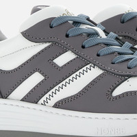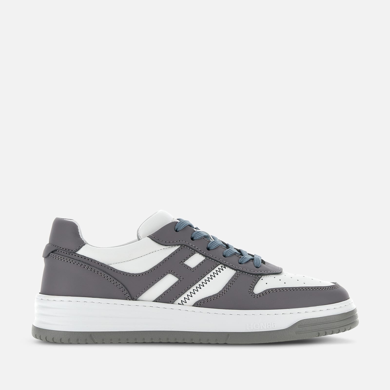 - Men's Hogan H630 Sneakers - Made in Italy - Smooth and nappa leather upper - Side H - Memory foam insole 0.4 ins - Rubber outsole - Total height 1.5 ins - Maintenance and care cards included - Fabric dustbag included - Additional laces included New sneakers with retro vibes, the Hogan H630 combines lines belonging to the basketball world and classic brand style. The smooth and nappa leather upper features an extended H that envelopes the heel. The outsole is crafted in extra-light EVA, with the new embossed HGN86 logo on the side and shaded stripes that reinterpret the historic Rebel grooves. True must-have for the contemporary wardrobe, this dynamic style is completed by a memory foam insole that ensures softness and cushioning. MOD. HXM6300EU50R374266