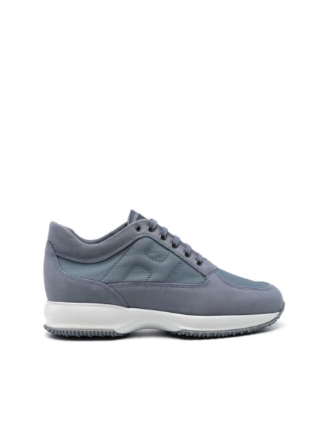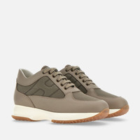 - Men's Hogan Interactive Sneakers - Made in Italy - Smooth leather upper - Woven fabric inserts - Exposed stitching - Embossed side H - Removable insole 0.5 ins - Rubber outsole - Total height 2.2 ins - Maintenance and care cards included - Fabric dustbag included - Additional laces included Hogan Interactive is a real timeless icon, characterized by an elegant design and a lightweight outsole to guarantee a tall-and-slim look. Since 1997 it gets renewed with each collection still representing an absolute functional and contemporary luxury icon. These sneakers in smooth leather with woven fabric inserts feature a padded side H. Perfect for an urban casual look.