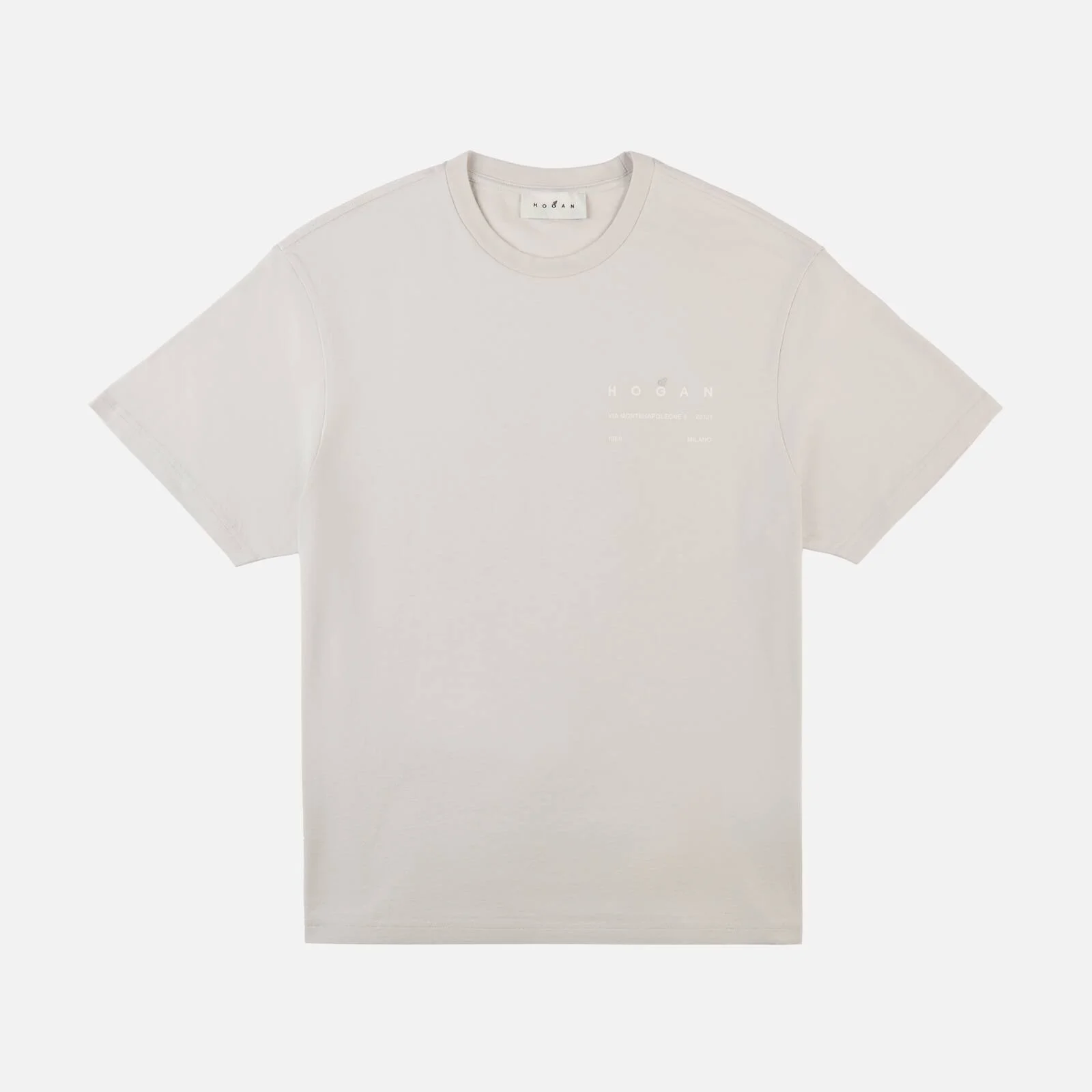 - Unisex T-shirt - Fitting: over - Item composition: 100% cotton, knit hems 100% cotton - Maintenance and care cards included Unisex round-neck T-shirt with boxy fitting, crafted in cotton jersey. Featuring a Via Monte Napoleone address logo print on the front, it comes with a silkscreen print with the same logo on a larger dimension on the back.
