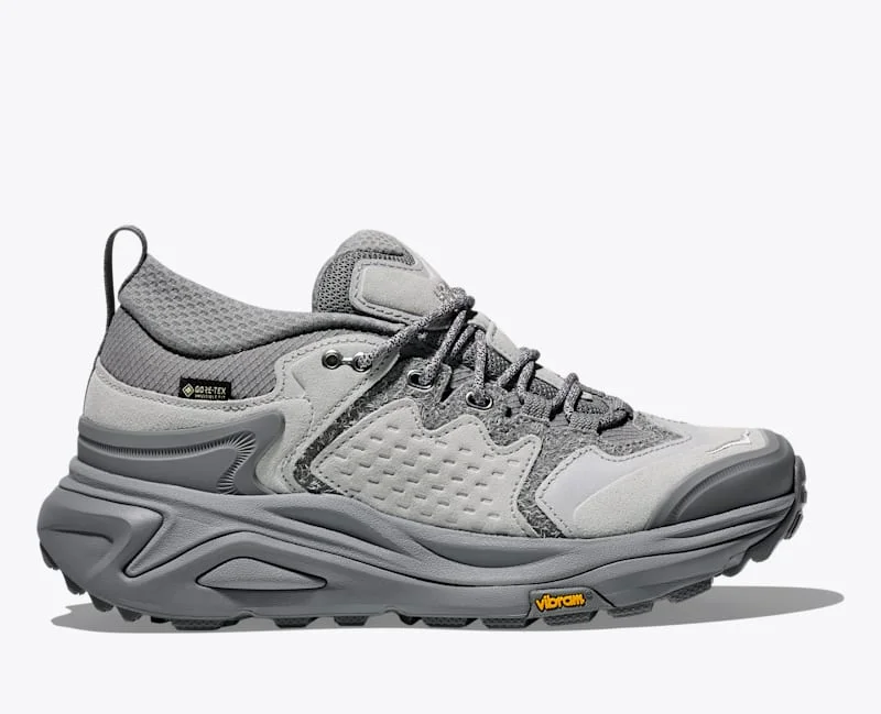 The trailblazing Kaha 3 Low GTX gets a vintage treatment for this season's Elite Terrain System Collection. Inspired by the burnished look boots earn with a life of adventure, we mixed distressed aesthetics with our latest HOKA trail technology. Two-tone hairy suede and nubuck upper detail. Lycra collar. Ripstop mesh underlay. GORE-TEX waterproof technology. Custom lace with secondary lace. Kaha 3 GTX midsole. Vibram Megagrip Outsole.