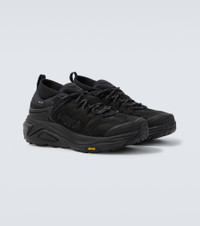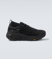 The Kaha 3 Low GTX hiking boots from Hoka One One are primed for comfort on your active pursuits. This pair is fitted with sock linings to combat foot fatigue, and set on thick ridged soles for a secure grip. Product Details - Upper: leather (suede), fabric - Lining: fabric - Sole: fabric insole, rubber sole - Color: black - Toe shape: round toe - Made in Vietnam - Includes: shoe box - Designer color name: Black / Black - Item number: P01143313 Size & Fit - Fits small to size - we recommend trying one size larger - US sizes