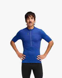 Designed and wear tested in tandem with elite HOKA athletes, the Sky Breeze Short Sleeve Zip delivers a lightweight base layer that effortlessly adapts to the changing temps. Strategically body mapped to ensure optimal thermoregulation, this slim-fit silhouette features a Dri Release blend at the lower torso and sleeves to maintain warmth when the mercury dips. Finished with a honeycomb knit at the back panel to mitigate moisture where the hydration pack sits, we've included an elongated zipper to vent on the fly. Mixed material offering. Quick drying. Sweat wicking. Slim fit silhouette. Anti-chafe mock neck construction. Elongated front zip for ventilation on the go. Reflective hits. HOKA Men's Sky Breeze Short Sleeve Zip Shirt in Ultramarine, Size Large