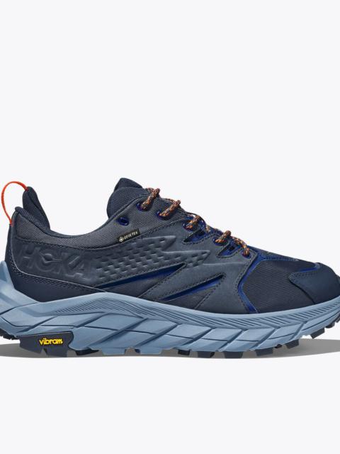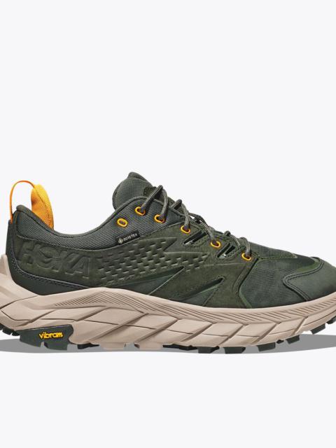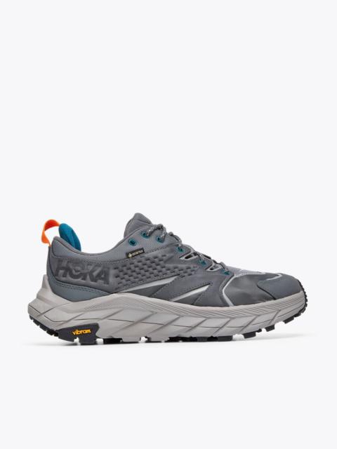 A day hiker designed with responsible manufacturing in mind, the Anacapa Low GTX is a low-profile take on the Anacapa Mid GTX. Engineered from lightweight leather certified by the Leather Working Group, the versatile silhouette employs recycled polyester in the collar, mesh and laces. This innovative style applies signature HOKA extended-heel geometry designed for a smooth ride on the trails. Item No. 1122017 Best for: Hiking Features: Leather Working Group Gold-rated waterproof nubuck leather Recycled polyester materials in collar, mesh and laces GORE-TEX footwear fabric with recycled textile Extended heel Vibram® Megagrip rubber with 5mm lugs PFC-Free water repellency treatment Quick lace hook Gusseted tongue Molded PU sockliner derived from 50% soybean oil Compression-molded foam midsole Late stage Meta-Rocker THE DETAILS Weight 14.00 oz Heel-To-Toe Drop 6.00 mm Volume 640.00 cm 3 Spring Measurement 37x32 mm Stability The Anacapa Low GTX features a symmetrical bed of cushion without additional prescriptive technologies. Designed to provide the support you want and nothing you don't. Cushion The Anacapa Low GTX is designed to provide protective cushion while maintaining a responsive toe-off for when you want to go faster.