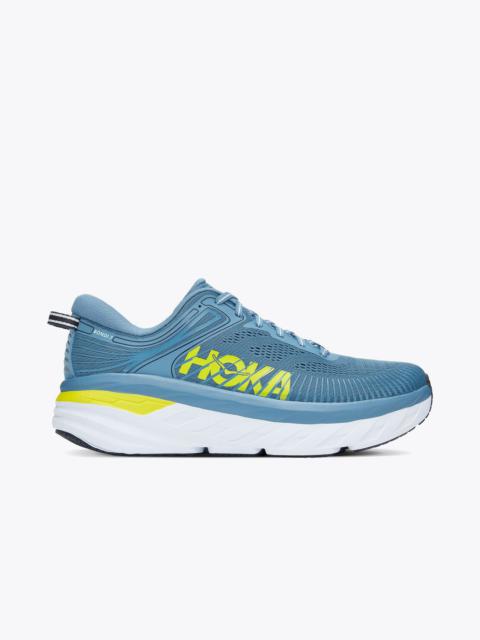 The most cushioned HOKA road shoe available, the Bondi 7 delivers a smooth and balanced ride. Engineered with the same full EVA midsole, breathable mesh upper and signature Meta-Rocker technology as its predecessor, the Bondi 7 is updated with a plush collar designed to accommodate a narrower heel - and conform to a wide variety of ankles. Item No. 1110518 Best for: Everyday Run Walking Features: Open mesh construction Memory foam collar Refined early stage Meta-Rocker Beveled heel Rubber outsole Vegan TPU overlay Full-length EVA midsole WHAT'S NEW Plusher collar to accommodate any ankle. THE DETAILS Weight 10.70 oz Heel-To-Toe Drop 4.00 mm Stability The Bondi 7 features a symmetrical bed of cushion without additional prescriptive technologies. Designed to provide the support you want and nothing you don't. Cushion The Bondi 7 features a higher bed of soft cushion, designed to provide a forgiving impact and ride.