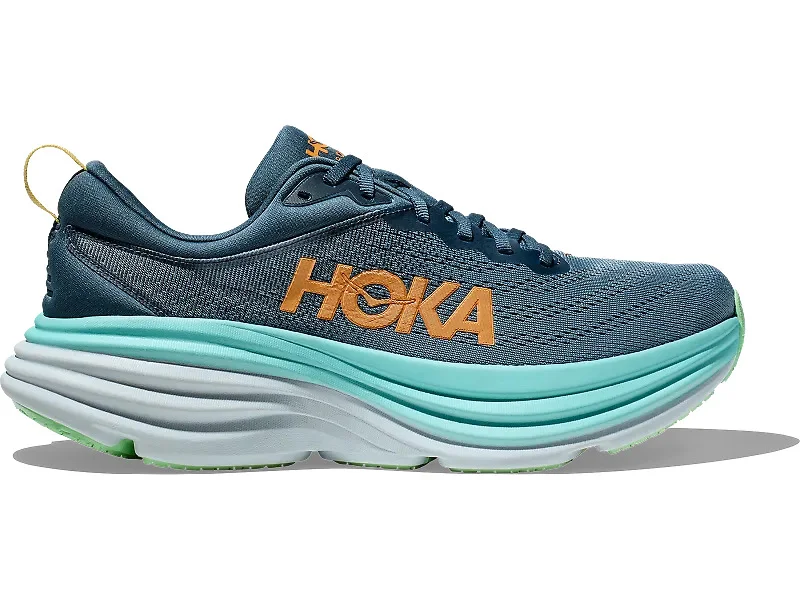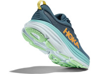One of the hardest working shoes in the HOKA lineup, the Bondi takes a bold step forward this season reworked with softer, lighter foams and a brand-new extended heel geometry. Taking on a billowed effect, the rear crash pad affords an incredibly soft and balanced ride from heel strike to forefoot transaction. Item No. 1123202 Best for: Everyday Run Walking Comfort Features: Engineered mesh construction Partially gusseted tongue 40% Recycled polyester eyestay lining Heel pull tab Ortholite® hybrid sockliner Lightweight, resilient foam Zonal rubber placement for weight savings Durabrasion rubber outsole Vegan Upper mesh with 50% recycled polyester 87% Recycled polyester strobel board 100% recycled polyester sockliner top cloth RN 88276 WHAT'S NEW Amplifying core performance features, the Bondi 8 is upgraded with an extended heel, brand-new foam, and pillowed tongue. THE DETAILS Weight 10.80 oz Heel-To-Toe Drop 4.00 mm Stability The Bondi 8 features a symmetrical bed of cushion without additional prescriptive technologies. Designed to provide the support you want and nothing you don't. Cushion The Bondi 8 features a higher bed of soft cushion, designed to provide a forgiving impact and ride.