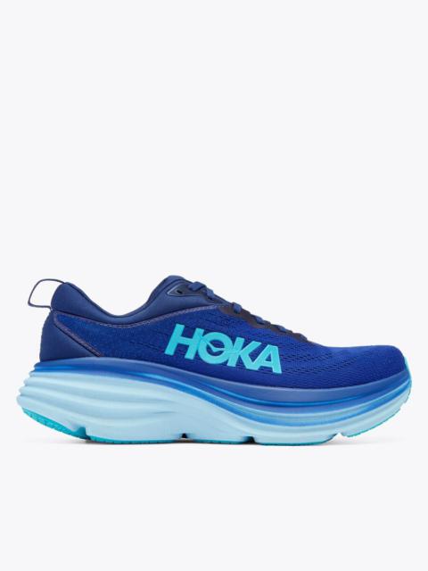 One of the hardest working shoes in the HOKA lineup, the Bondi takes a bold step forward this season reworked with softer, lighter foams and a brand-new extended heel geometry. Taking on a billowed effect, the rear crash pad affords an incredibly soft and balanced ride from heel strike to forefoot transaction. Item No. 1123202 Best for: Everyday Run Walking Comfort Features: Engineered mesh construction Partially gusseted tongue 40% Recycled polyester eyestay lining Heel pull tab Ortholite® hybrid sockliner Lightweight, resilient foam Zonal rubber placement for weight savings Durabrasion rubber outsole Vegan Upper mesh with 50% recycled polyester 87% Recycled polyester strobel board 100% recycled polyester sockliner top cloth RN 88276 WHAT'S NEW Amplifying core performance features, the Bondi 8 is upgraded with an extended heel, brand-new foam, and pillowed tongue. THE DETAILS Weight 10.80 oz Heel-To-Toe Drop 4.00 mm Stability The Bondi 8 features a symmetrical bed of cushion without additional prescriptive technologies. Designed to provide the support you want and nothing you don't. Cushion The Bondi 8 features a higher bed of soft cushion, designed to provide a forgiving impact and ride.