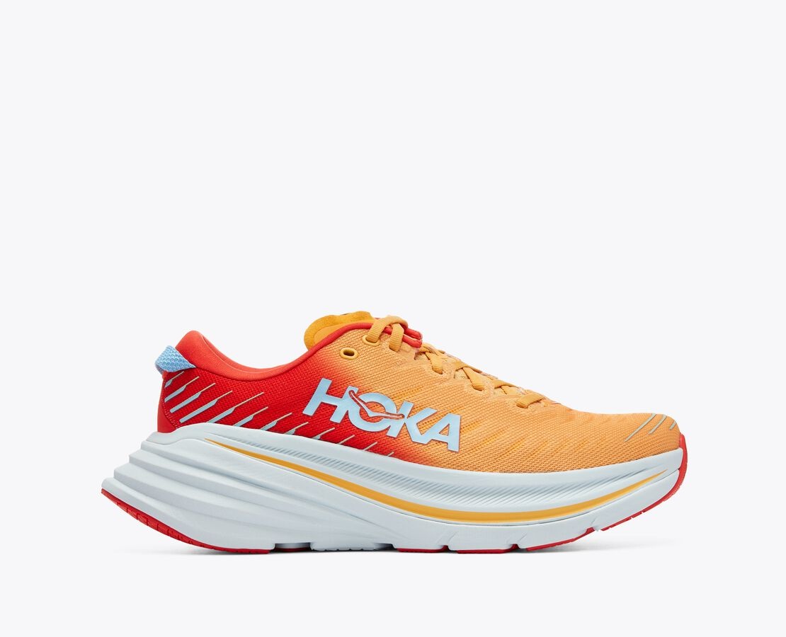 A maximally-cushioned road shoe designed to go the distance, the Bondi X is spring-loaded with a propulsive carbon fiber plate. The original Bondi cushioning and lines are here, providing the soft, balanced ride for which the franchise is known. The Bondi X fine-tunes the geometry with an extended rocker for greater acceleration, while the carbon fiber plate is designed to provide an efficient transition and smooth toe-off. Item No. 1113512 Best for: Everyday Run Race Features: Mesh upper with 3D hotmelt yarns Carbon fiber plate Compression-molded foam Early stage Meta-Rocker Light zonal rubber THE DETAILS Weight 11.00 oz Heel-To-Toe Drop 5.00 mm Volume 884.00 cm 3 Spring Measurement 35x30 mm Stability The Bondi X features a symmetrical bed of cushion without additional prescriptive technologies. Designed to provide the support you want and nothing you don't. Cushion The Bondi X features a higher bed of soft cushion, designed to provide a forgiving impact and ride.