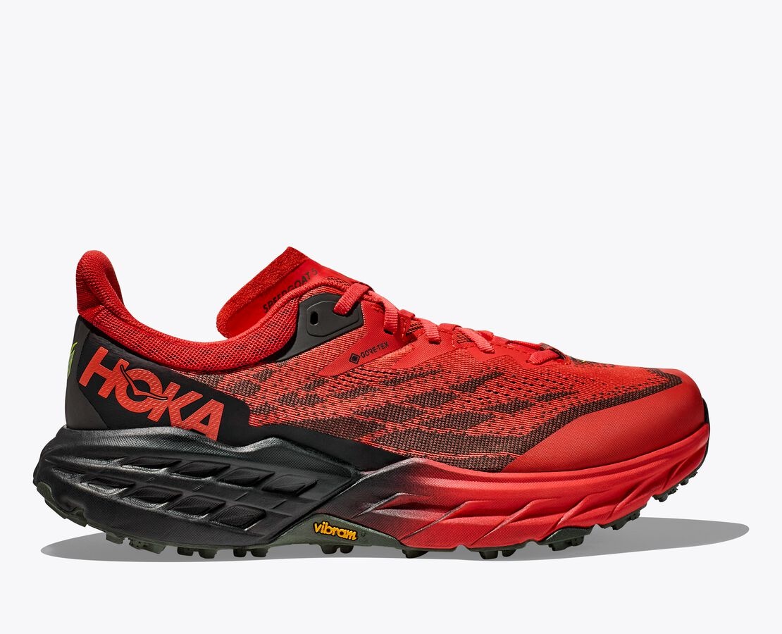 A workhorse for sloppy, wet conditions, the Speedgoat 5 offers a brand-new upper and enhanced moisture management in the way of a GORE-TEX membrane. Grounded in the same Vibram® Megagrip with Traction Lug for increased grip on loose soil, this trail icon employs a foot-cradling heel bolster, rubber toe cap, and gusseted tongue to keep trail debris at bay. Item No. 1127912 Best for: Trail Running Hiking Features: Lay-flat gusseted tongue construction GORE-TEX with recycled textiles Rubber toe cap Compression molded EVA midsole Vibram ® Megagrip with Traction Lug Double-layer jacquard engineered mesh Bolstered heel collar construction Late stage Meta-Rocker Molded EVA sockliner 5mm lugs Vegan RN 88276 WHAT'S NEW It’s everything you love about the Speedgoat 5, now updated with waterproof versatility. THE DETAILS Weight 11.50 oz Heel-To-Toe Drop 4.00 mm Stability The Speedgoat 5 GTX features a symmetrical bed of cushion without additional prescriptive technologies. Designed to provide the support you want and nothing you don't. Cushion The Speedgoat 5 GTX is designed to provide protective cushion while maintaining a responsive toe-off for when you want to go faster.