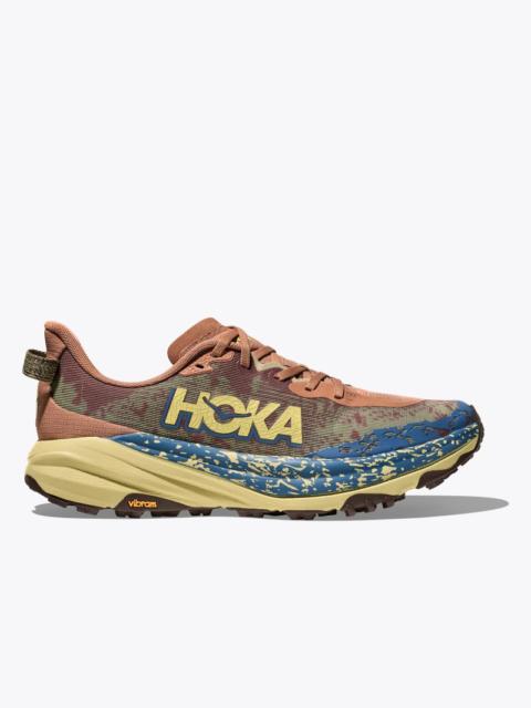 A grippy, responsive ride for technical terrain. There's only one GOAT on the trail. And this is it. Combining HOKA's tried and true cushioning with aggressive traction and ultralight materials, the Speedgoat 6 was born to tame the trail. A workhorse for technical terrain, this recent reissue was refined with a breathable woven textile upper, foot-hugging internal chassis, plusher dual gusset tongue, and revised lug orientation inspired by the hoof of a goat (what else?) Lightweight woven upper. Internal support chassis. Dual-sided gusseted tongue. Dynamic vamp. Protective toe bumper. Vibram Megagrip with Traction Lug. Revised lug orientation. Light, responsive midsole compound. Lighter more responsive foam. 5mm lugs. Vegan.