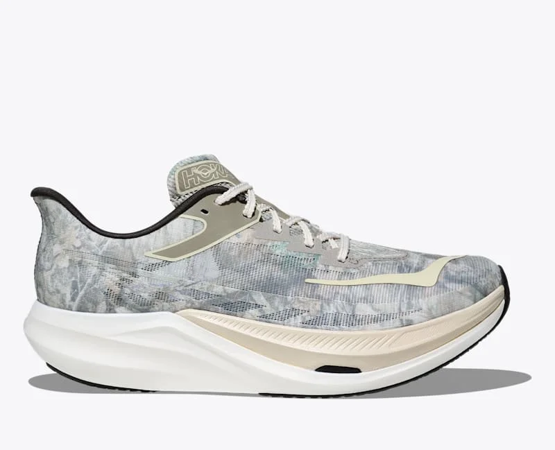 A new flex for your running shoe rotation, our latest Rocket X3 serves up the same speed-focused ride in a quietly commanding silhouette. Co-created with John Elliott, a Los Angeles-based designer best known for his timeless designs and considered construction, this carbon-plated super shoe blends aesthetics and athletics like never before. Drawing from Elliott's Northern Californian roots, we pulled from the coastline's natural cues-coupling a road-ready rubber sole with resilient, high-performance foam and a bold camouflage upper that's designed to be seen. Sublimated mesh camo upper. Carbon fiber plate. Dual-density PEBA foam. Sticky rubber outsole. Secondary set of laces.