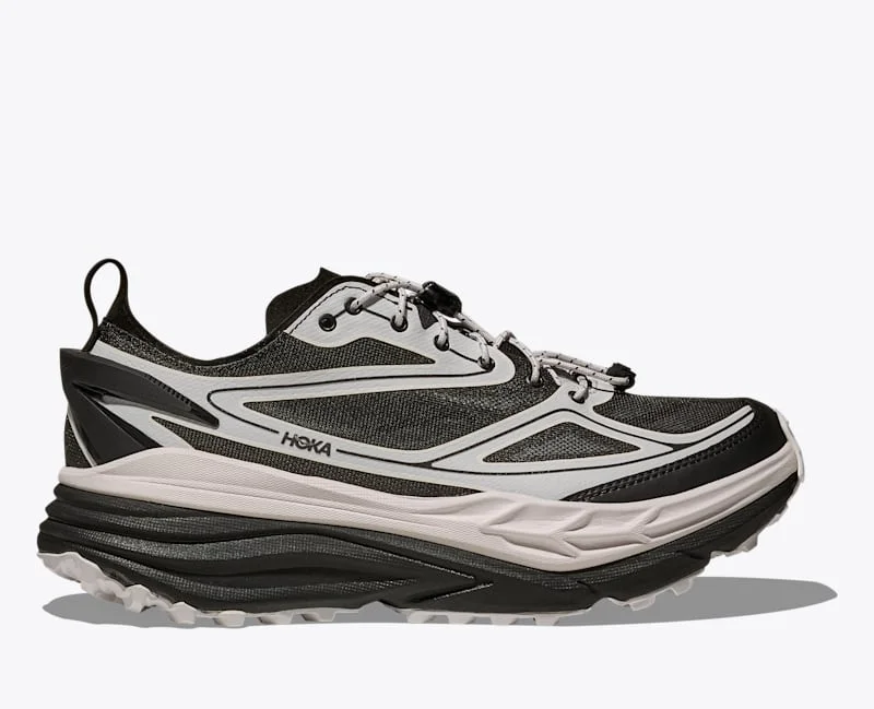 In iconic black-and-white and all-black palettes, the Stinson One7+ is our newest hybrid, distinctly influenced by Dover Street Market's aesthetic. Blending classic HOKA design with elevated technical features, it pairs the renowned tooling and comfort of the Stinson 7 with a translucent upper and internal cage inspired by the Stinson Lite. Finished with a 3D-molded TPU heel clip and wrapped in DSM's signature tones, this reworked trail runner captures the bold, experimental spirit of HOKA. Translucent mono-mesh upper. Internal cage detail. 3D-molded TPU heel clip. Reflective cage on Black/Carbon White style. Speed lace (Two additional reflective flat laces included). Padded foam tongue and collar. Stabilizing H-Frame technology. Compression-molded EVA foam midsole. Multi-directional rubber outsole lugs.