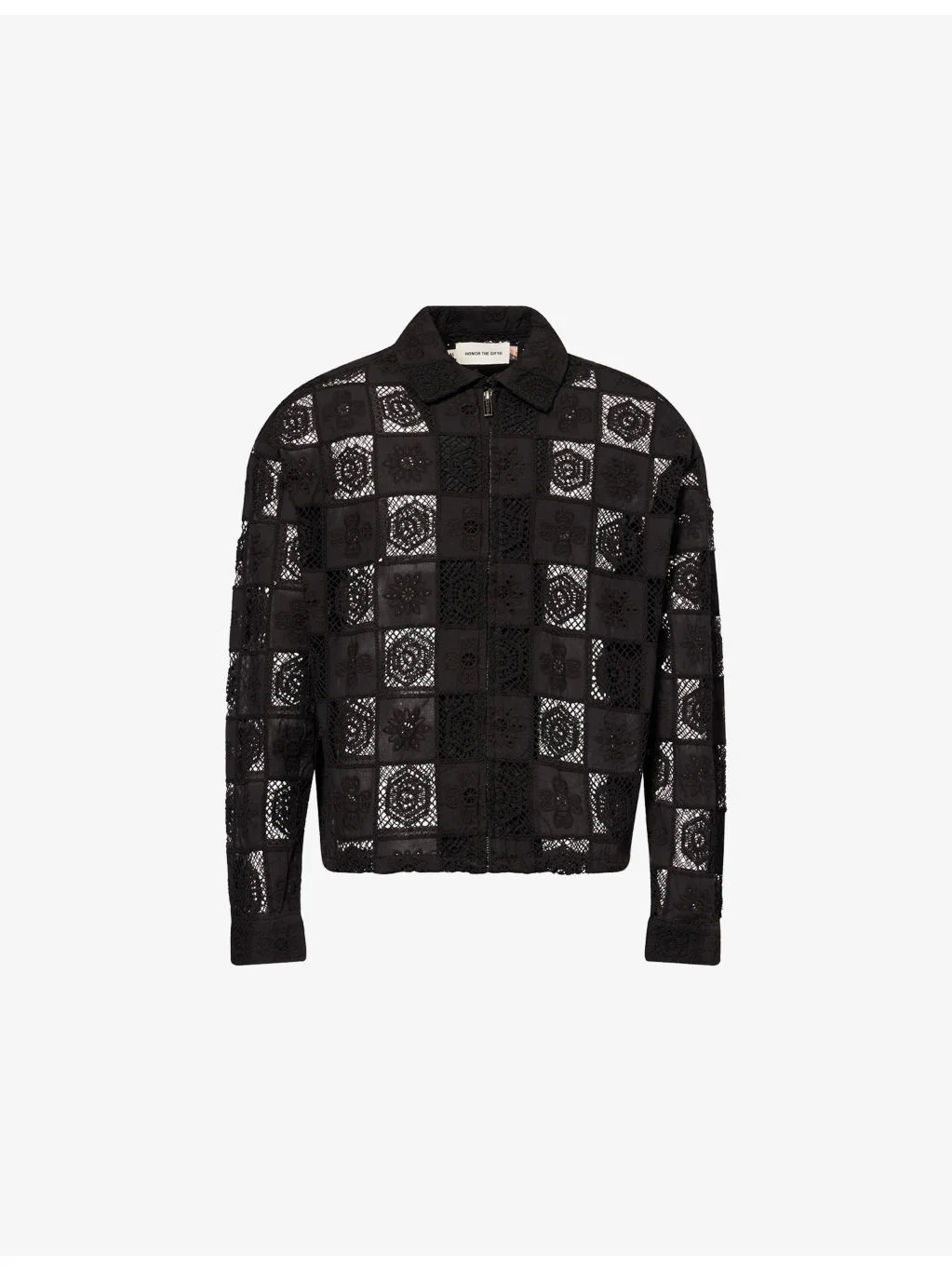 PRODUCT DETAILS - Honor The Gift cotton jacket - 100% cotton - Concealed zip fastening - Regular fit, pointed collar, long sleeves, popper-fastened cuffs, all-over crochet patchwork, logo tab at hem, branded zipper - Hand wash cold - Size medium: length 28in / 71cm, chest 52in / 130cm - Model is 6ft 2in/1.88m and wears a size medium - Lightweight, non-stretch Ref: R04538667