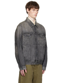 Non-stretch organic cotton denim jacket. · Fading and hand-distressing throughout · Spread collar · Button closure · Flap and welt pockets at front · Buttoned cuffs · Adjustable button tabs and logo patch at back hem Supplier color: Heavy black vintage 100% organic cotton. Made in Portugal 252995M177000