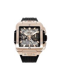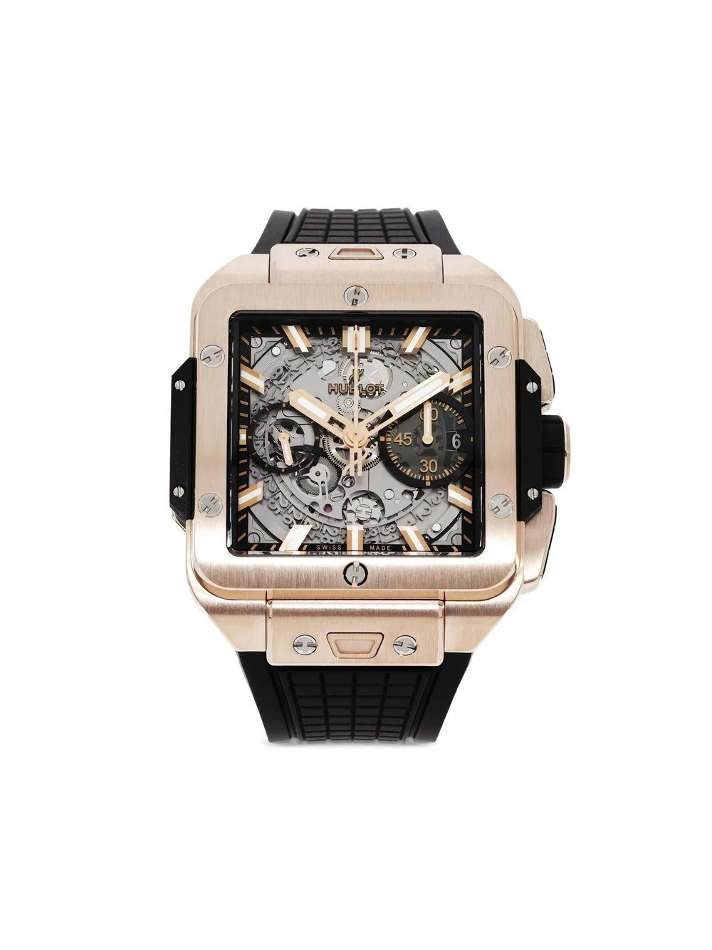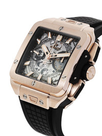 Square Bang Unico King Gold 42mm Fine watch specialists Hublot are notorious for their take on a 'fusion' concept, bridging the gap between skilful and technical details, with an artistic and elegant finish. Take this Square Bang Unico King Gold 42mm, for example, the sleek chronograph counters are contrasted by a heavy-duty skeleton dial for the ideal balance between function and form. Highlights - 42mm - Yellow gold - Square face - Skeleton dial - Baton dial - Baton hands - Chronograph counters - Screw-down crown - Rubber strap - Buckle fastening - Quartz movement - This piece is new and unworn. - Original box, papers and boutique certificate included. - An inspection by the boutique-certified watchmakers guarantees authenticity. - All repairs of the movement of the watch and the repairs of water-resistant watches with water damage are covered by the boutique two-year warranty. - Normal everyday use and external agents may reduce the lustre of gemstones and gold surfaces. to maintain, use specific, non-abrasive products specially meant for cleaning jewellery. Imported Composition Rubber 100%, Yellow Gold 100%, Sapphire Glass 100% SIZE & FIT Measurement Case size 1.65 in(42 mm)