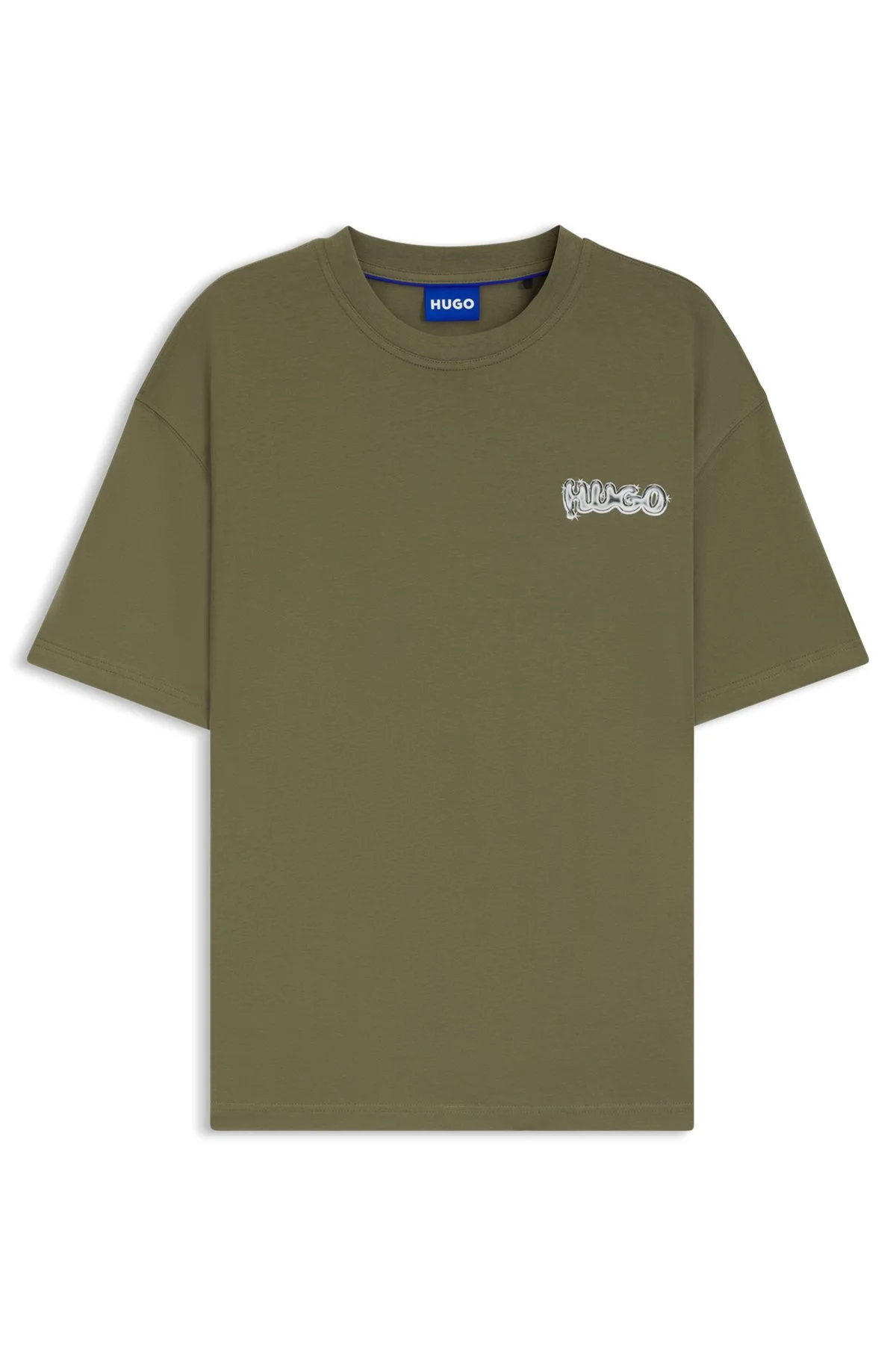 SIZE AND FIT The model wears a size M and is 6'2" tall with a, 37" chest, 29" waist and 37" hips. DETAILS Printed front and back with logos in a fresh chrome effect, this all-gender T-shirt from HUGO is a casual must. Soft cotton jersey. Loose fit. loose fit Neckline: Crew neck Short sleeves Standard length Nyrotee - 50549769 QUALITY & CARE INSTRUCTIONS Do Not Tumble Dry Iron Low Heat Do Not Dry Clean Machine Wash Cold Gentle Do Not Bleach Quality: 100% Cotton