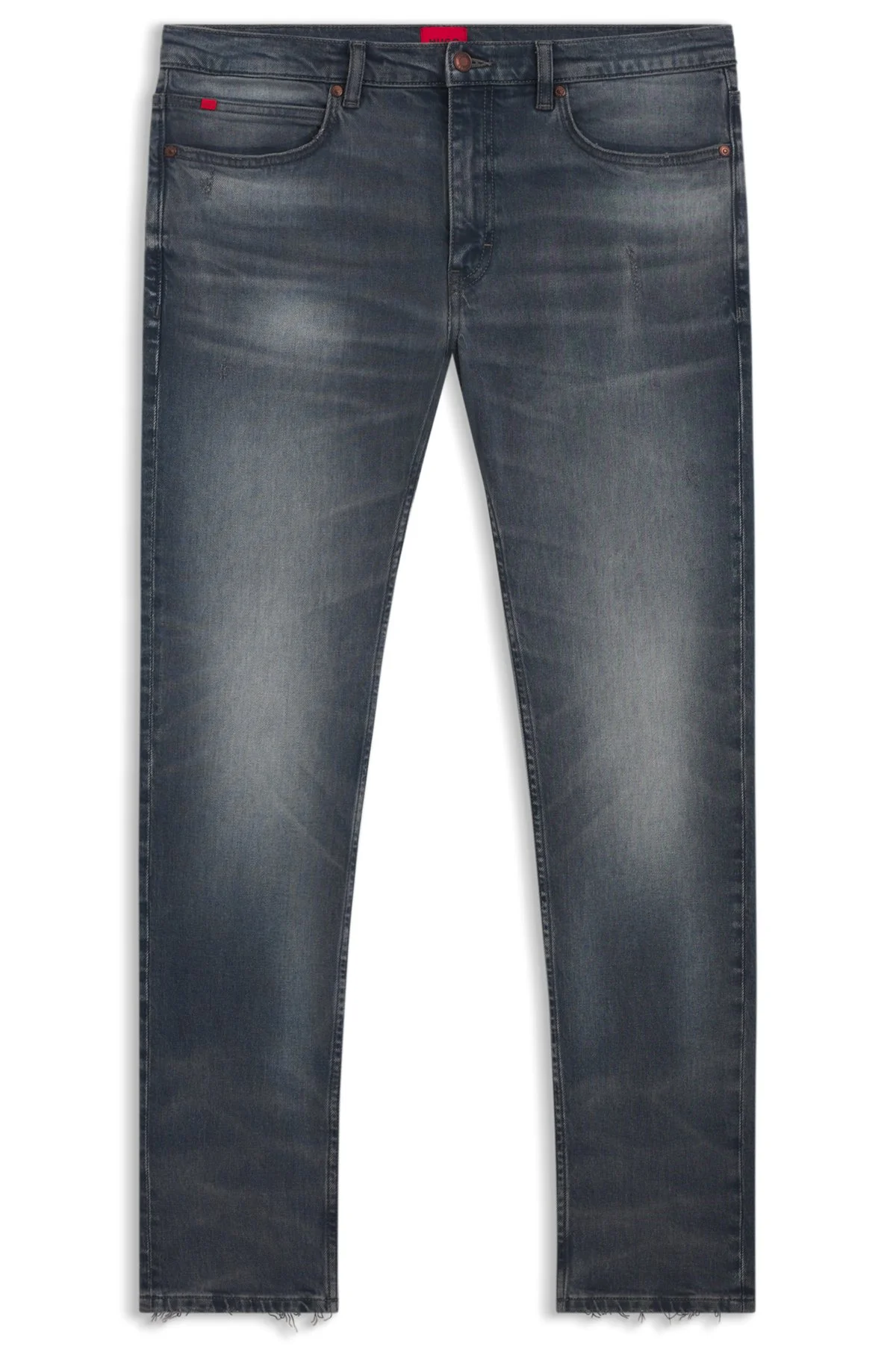 DETAILS Cut in stretch denim with authentic distressed details, these branded HUGO Menswear jeans offer a fresh foundation. Super-slim fit with an ash-blue tone. Extra-slim fit Mid rise Button and zip closure Pockets bottom front: Side pockets Skinny leg Pockets bottom back: Patch pocket Standard length Fit foot width: 34,0 cm (13.4 inches) HUGO 734 - 50555167 QUALITY & CARE INSTRUCTIONS Do Not Bleach Material: 99% Cotton, 1% Elastane, pocketing: 100% Cotton Do Not Dry Clean Machine Wash Cold Gentle Do Not Tumble Dry Iron Medium Heat