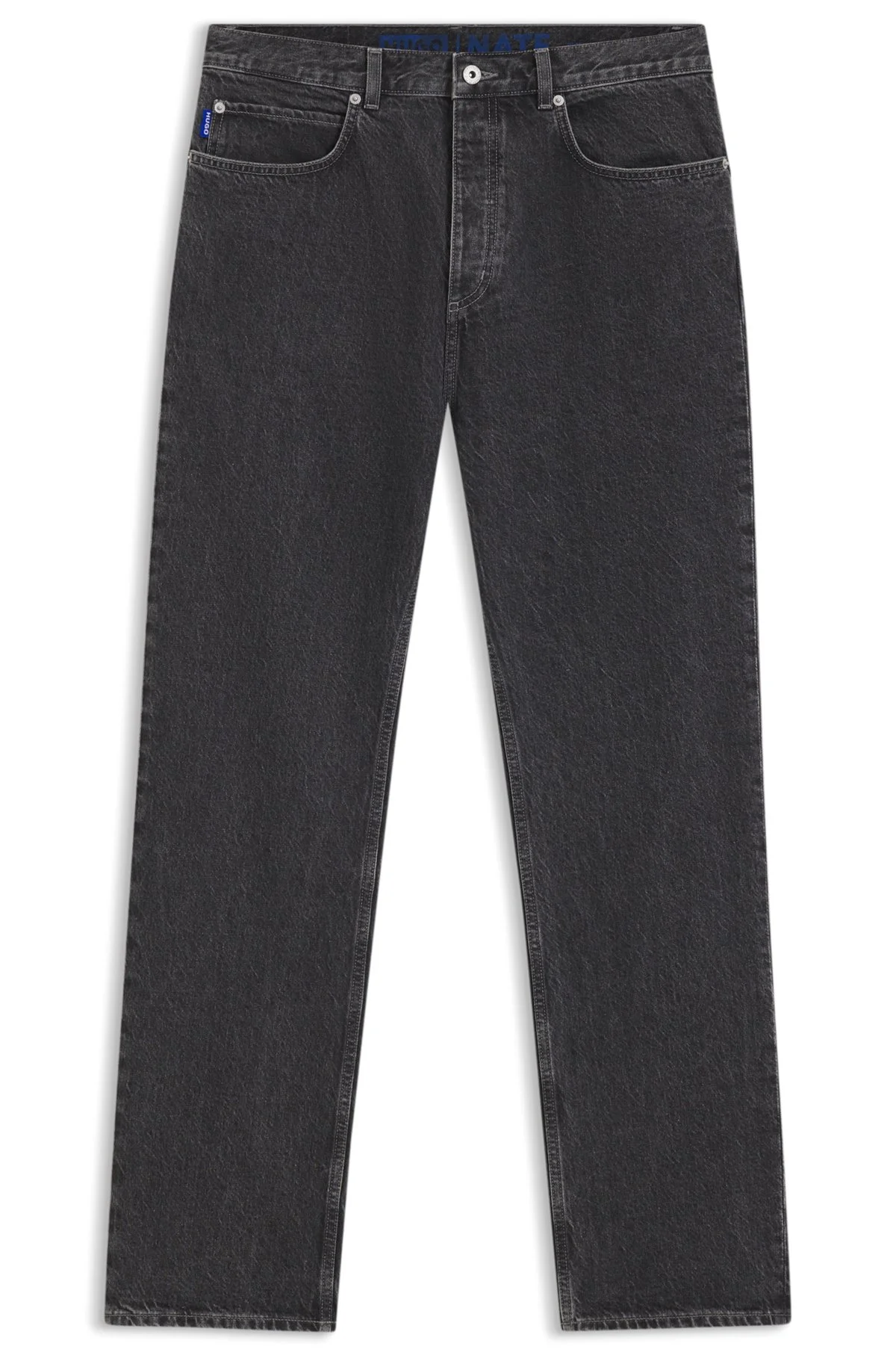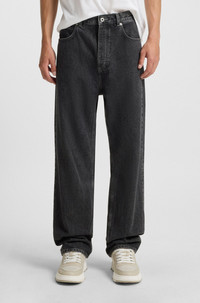 SIZE AND FIT The model wears a size 32/32 and is 6'2" tall with a, 35" chest, 27" waist and 35" hips. DETAILS Nate - 50547152 With a faded logo print across the back, these wide-leg HUGO Menswear jeans have modern edge. Baggy fit. Vintage-washed black denim. baggy fit Mid rise Button closure Pockets bottom front: Side pockets Wide leg Pockets bottom back: Patch pocket Standard length Fit foot width: 44,0 cm (17.3 inches) QUALITY & CARE INSTRUCTIONS Do Not Tumble Dry Machine Wash Cold Gentle Quality: 100% Cotton, pocketing: 100% Cotton Iron Medium Heat Do Not Bleach Do Not Dry Clean