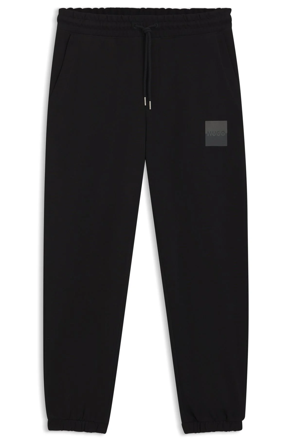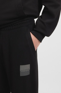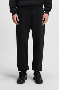 SIZE AND FIT The model wears a size M and is 6'2" tall with a, 36" chest, 28" waist and 36" hips. DETAILS Dusplitan - 50542866 Printed with a split logo, these HUGO Menswear tracksuit bottoms are ideal on casual days. Relaxed fit in soft cotton terry. Relaxed fit Drawstring Cuffed leg Pockets bottom front: Side slash pockets QUALITY & CARE INSTRUCTIONS Do Not Dry Clean Do Not Tumble Dry Machine Wash Cold Gentle Iron Low Heat Quality: 100% Cotton Do Not Bleach