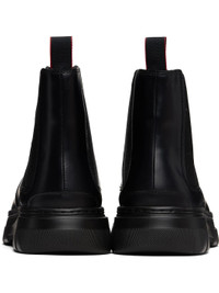 Ankle-high buffed leather Chelsea boots in black. · Elasticized gusset at sides · Logo embossed at outer side · Pull-loop at heel collar · Buffed faux-leather lining · Treaded rubber sole Supplier color: Black Upper: leather. Sole: rubber. Made in Lao Peoples Republic 252084M223001