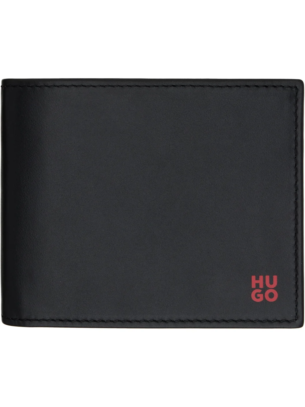 Buffed leather trifold wallet. · Logo stamp at face · Eight card slots at interior · Two patch pockets and two note slots · ID slot and coin compartment · Twill lining · H3.75" x W4.5" x D0.75" Supplier color: Black Leather. Made in India 252084M164010