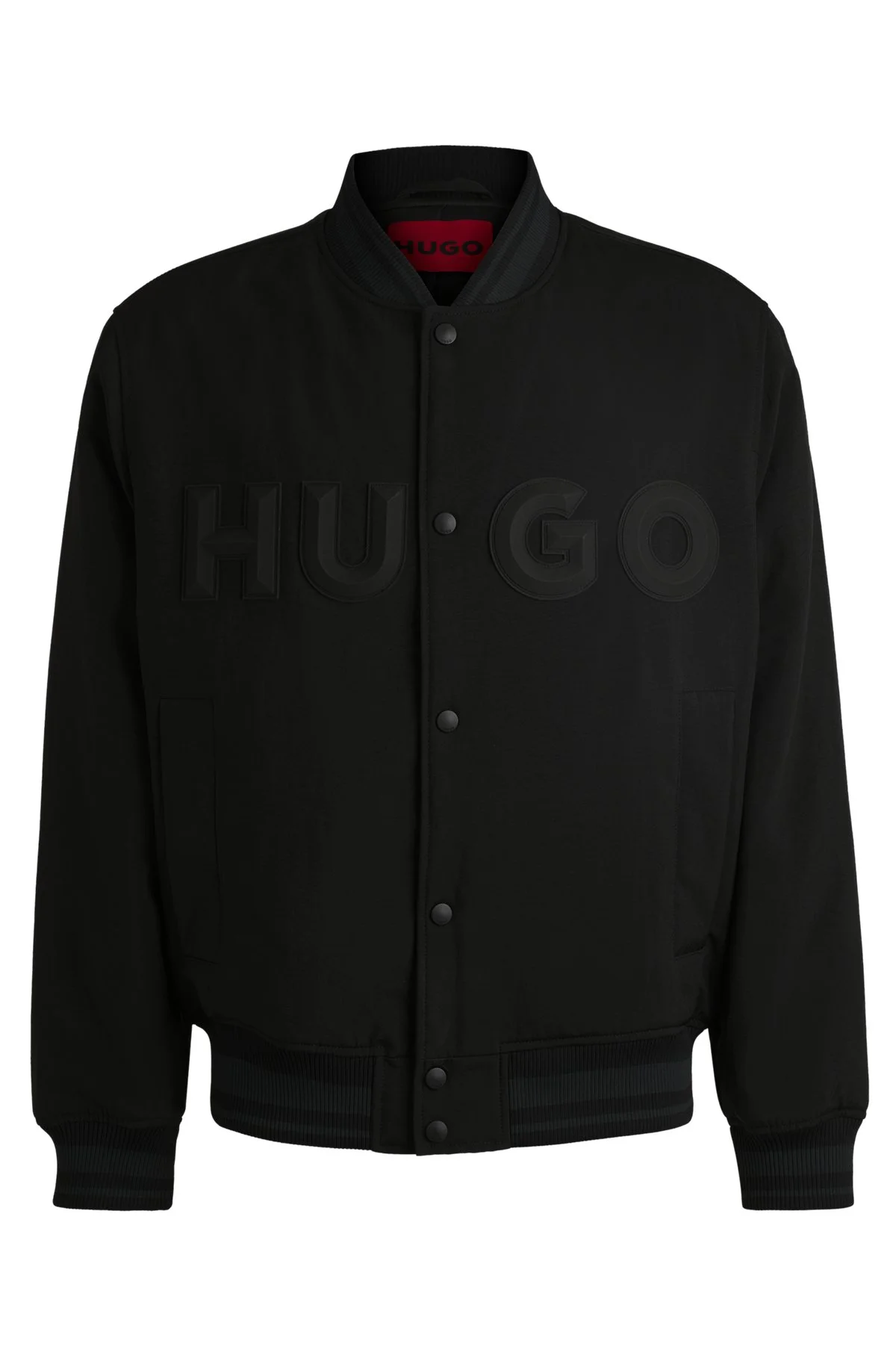 SIZE AND FIT The model wears a size L and is 6'2" tall with a, 34" chest, 29" waist and 35" hips. DETAILS Bozo2511 - 50530782 A water-repellent bomber jacket in canvas by HUGO Menswear. This piece is cut to a relaxed fit with a rubberized logo across the front. Relaxed fit Point collar Fastening top: Zip closure Pockets top: Patch pockets Inside zip pockets Ribbed cuffs Fully lined Standard length QUALITY & CARE INSTRUCTIONS Iron Low Heat Quality: 100% Polyamid, Lining: 100% Polyester, Knitwear: 65% Polyamid, 25% Polyester, 10% Elastane, Wadding: 100% Polyester Machine Wash Cold Gentle Do Not Bleach Do Not Tumble Dry Do Not Dry Clean
