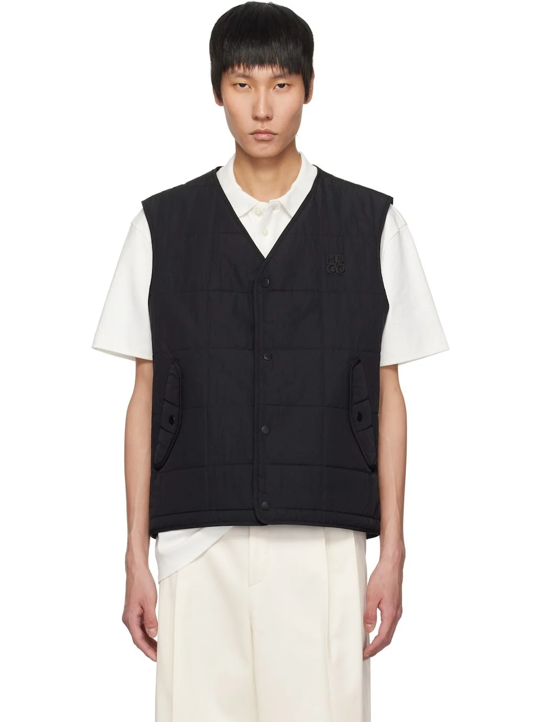 Padded and quilted nylon taffeta vest. · Stand collar · Press-stud closure · Rubberized logo patch at chest · Flap pockets · Zip pocket at interior · Full satin lining Supplier color: Black Body: 100% polyamide. Fill: 100% polyester. Lining: 100% polyester. Made in Bangladesh 251084M185000