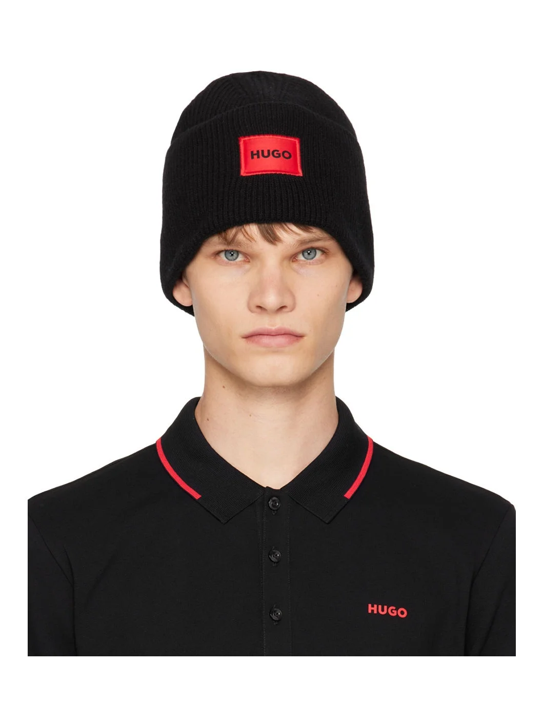 Rib knit recycled wool-blend beanie in black. Logo patch at rolled brim. Supplier color: Black 40% recycled wool, 40% wool, 20% recycled polyamide. Made in Spain 242084M138002