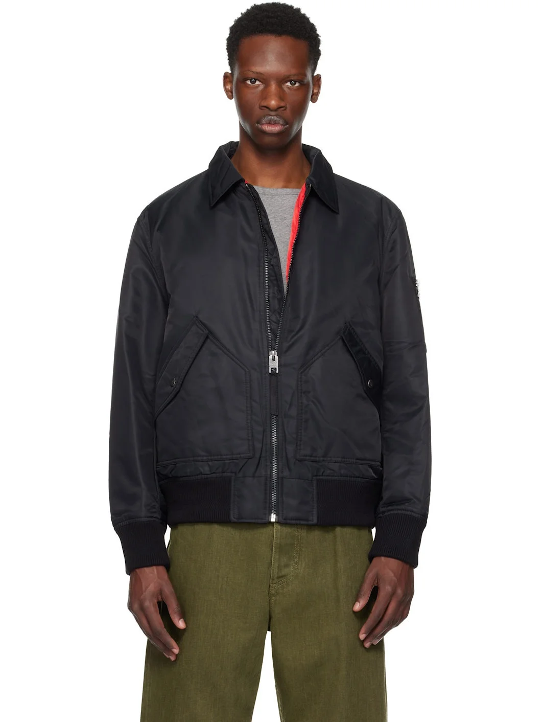 Insulated recycled nylon taffeta bomber jacket. · Spread collar · Zip closure · Flap pockets · Rib-knit hem and cuffs · Utility pocket at sleeve · Logo-bonded locker loop at back collar · Welt pocket at interior · Full satin lining · Logo-engraved gunmetal-tone hardware Supplier color: Black Body: 100% recycled polyamide. Trim: 100% cotton. Fill: 100% polyester. Lining 1: 100% polyester. Lining 2: 100% polyester. Made in Indonesia 252084M175002