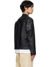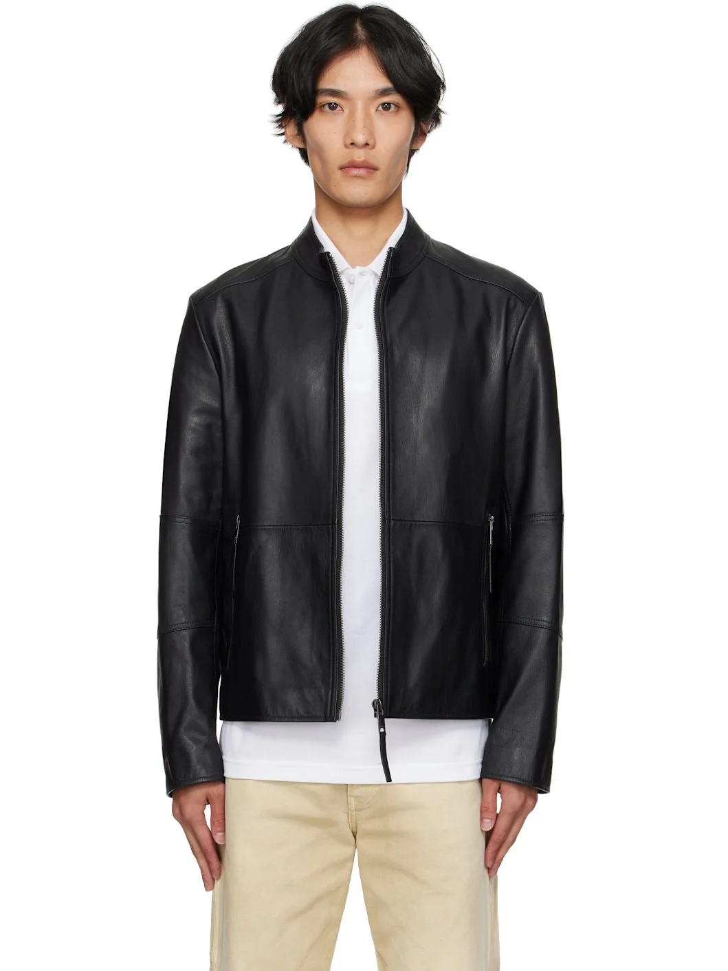 Grained goatskin jacket. · Stand collar · Zip closure · Zip pockets at waist · Logo embossed at back collar · Full satin lining Supplier color: Black Body: 100% goatskin. Lining: 100% polyester. Made in India 252084M181003